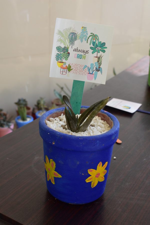 A potted plant with long, dark green leaves is housed in a blue pot hand-painted with a yellow flower design. A sign reading “always GROW” surrounded by various plant illustrations is attached to a green stick in the white pebble-filled soil. The pot sits on a wooden table, surrounded by other small potted plants and decorative cards, creating a bright and nature-inspired setting.