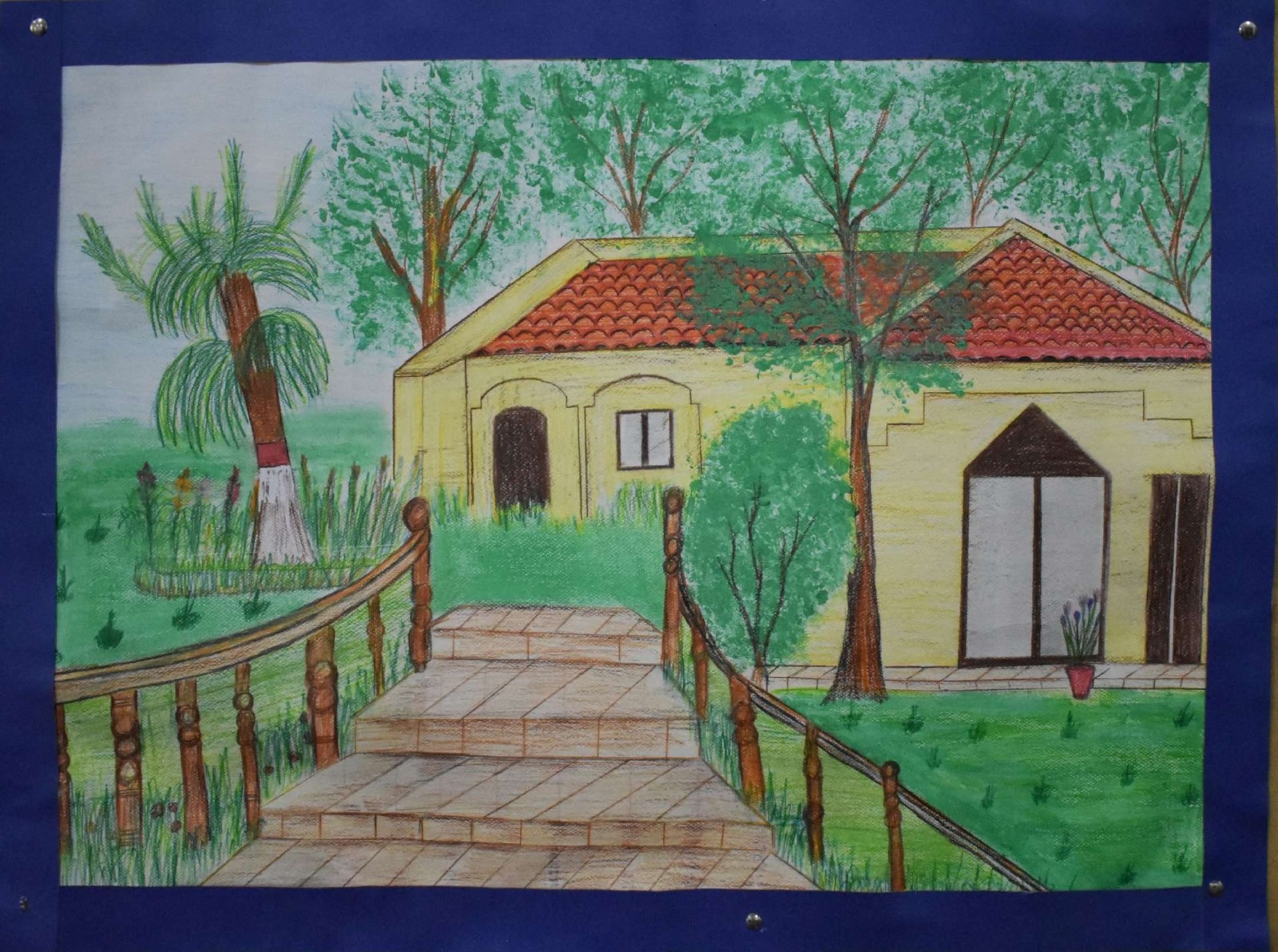 This detailed colored pencil drawing captures the serene beauty of a cozy cottage surrounded by lush greenery. The image depicts a stone pathway leading to a charming yellow house with a red tiled roof. The surrounding trees, flowers, and garden add a peaceful natural vibe to the scene. The soft, gentle shading of the plants and the detailed texture of the building make this artwork a perfect addition to any space, evoking a sense of warmth and tranquility in nature.