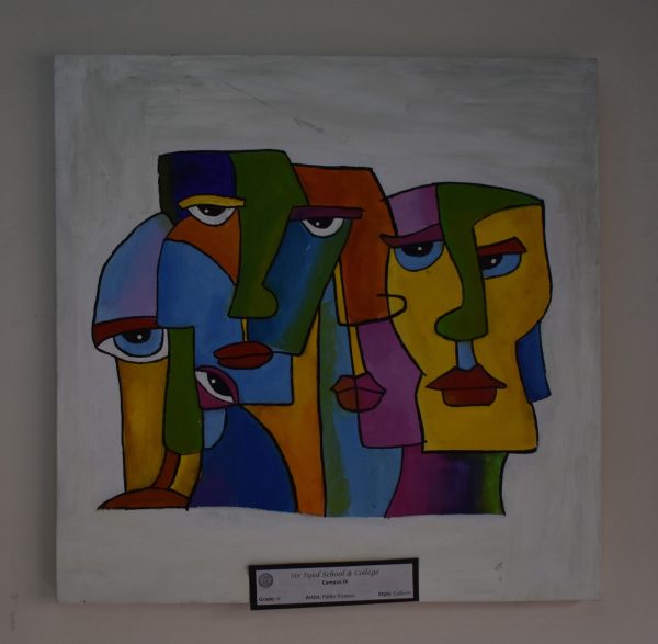This powerful composition, created by a Grade V student from Sir Syed School & College, Campus-IX, channels the essence of Pablo Picasso’s cubist style. The piece features a series of abstract faces, each one divided into geometric sections, representing the complexity of human expression. The use of bold, contrasting colors and exaggerated facial features conveys a range of emotions and perspectives, while the fragmented forms reflect the multi-dimensional nature of human identity. This artwork is a striking example of how cubism allows us to see familiar subjects from multiple angles, offering a deeper understanding of both the subject and the artist’s vision.