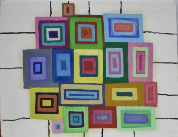 This bold and vibrant abstract painting features a dynamic arrangement of colorful rectangles, creating an energetic and visually engaging composition. The use of a variety of bright colors—such as pink, green, blue, and yellow—creates a striking contrast against the minimalist white background. The clean lines and geometric structure evoke a sense of modernity and order, making it a perfect piece to add a pop of color and sophistication to any contemporary space. Ideal for lovers of abstract and geometric art, this painting will energize and inspire any room.