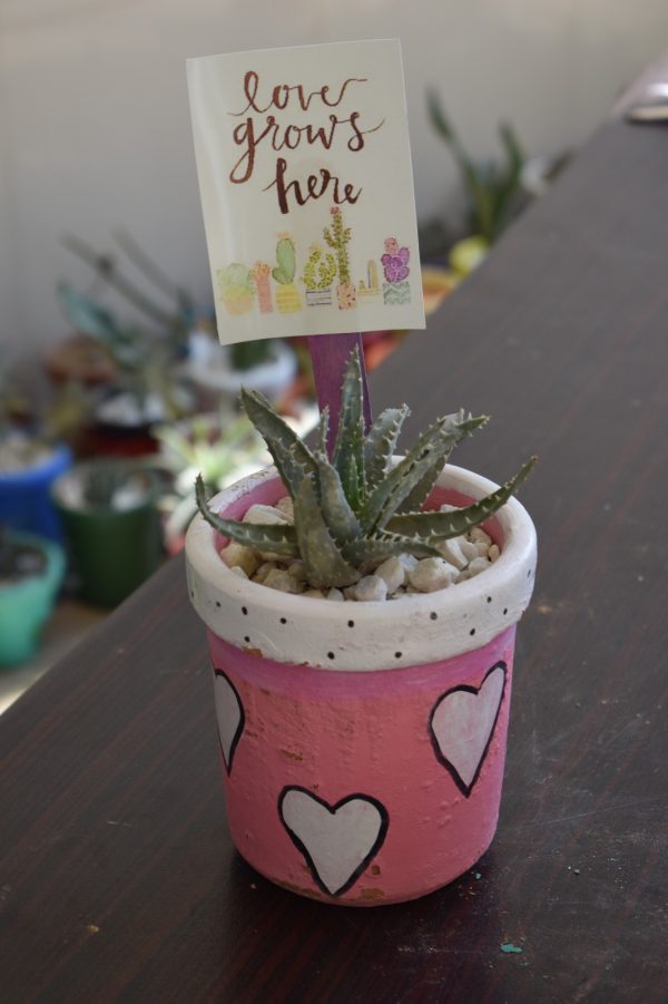 A charming small succulent plant (appears to be a Haworthia) with distinctive white-spotted green leaves arranged in a rosette pattern, nestled in a delightful pink and white terracotta pot. The pot features a whimsical design with white hearts painted on a pink base and a white rim decorated with small black polka dots. Rising from the plant is the same inspiring “love grows here” sign with elegant script lettering, adorned with watercolor illustrations of various potted cacti and succulents at the bottom. White decorative pebbles top the soil, and the arrangement sits among other colorful planters in the background, creating a sweet and nurturing indoor garden atmosphere that perfectly embodies the message of love and growth.