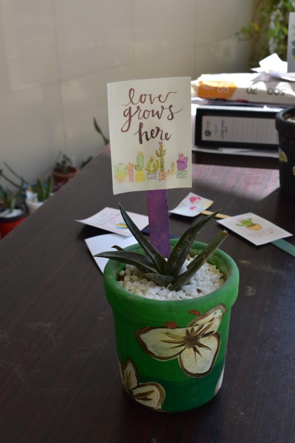 A small potted plant with dark green, pointed leaves sits in a hand-painted green pot adorned with floral designs. A decorative sign reading “love grows here” with colorful cactus illustrations is attached to a purple stick, placed in the white pebble-filled soil. The pot is set on a wooden table, surrounded by other small plants and cards with similar designs, suggesting a cozy, nature-themed setting.