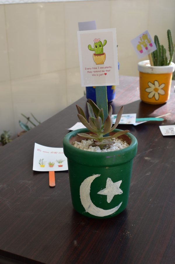 A small potted plant with thick, fleshy leaves is placed in a green pot featuring a white crescent moon and star, resembling the flag of Pakistan. A sign with a cute cactus illustration and the text “Every time plants, they say life is just love” is attached to a blue stick in the white pebble-filled soil. The pot sits on a wooden table alongside other potted plants and decorative cards with plant-themed designs, creating a patriotic and nature-inspired setting.