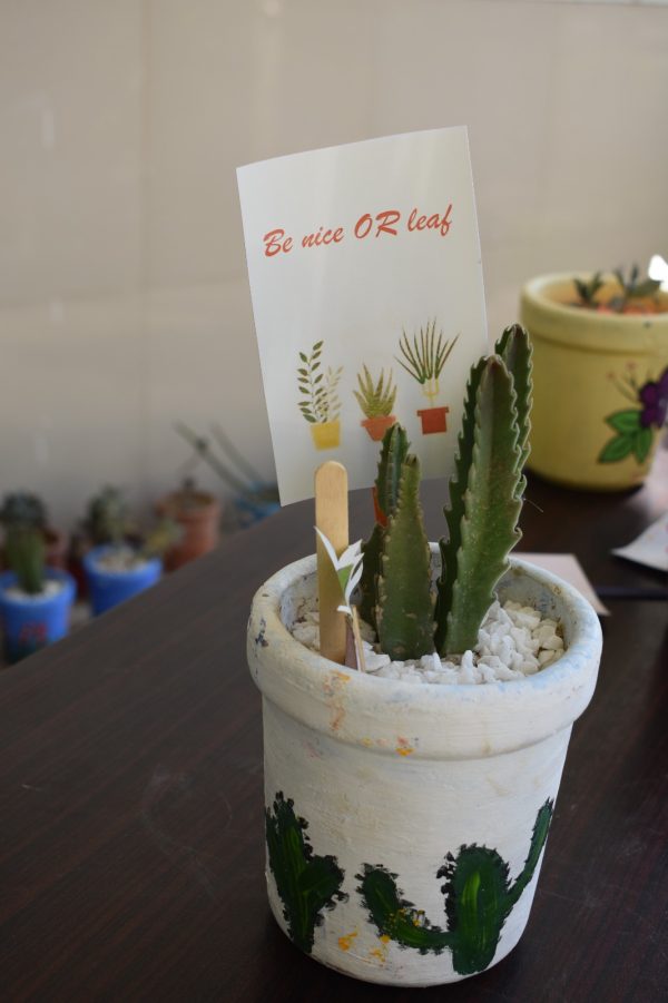 A small cactus with wavy, green stems grows in a hand-painted white pot featuring green cactus illustrations along the rim. A wooden stake holds a card with the witty message “Be nice OR leaf” and plant drawings, set against a backdrop of other potted plants on a wooden surface.