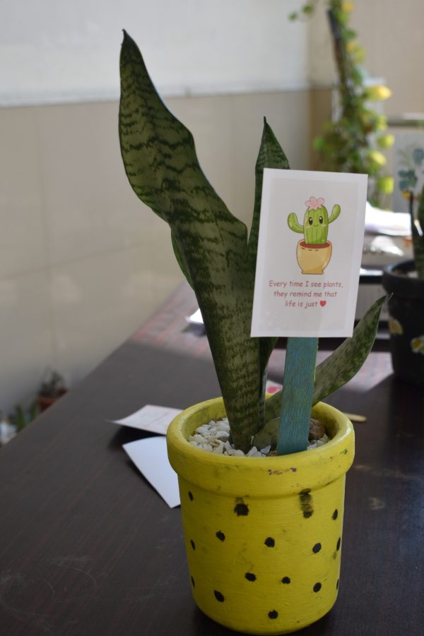 A vibrant yellow pot with black polka dots houses a snake plant with long, patterned green leaves. A green stake holds a card featuring a cute cactus illustration and the uplifting message “Every time I see plants, they remind me that life is just ♥,” adding a cheerful and positive touch to this indoor plant display.